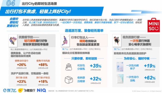 今年“city不city”的梗在社交網絡上走紅,網友們借梗來展示個性化、多樣化的城市打卡方式,背后體現的更是當下年輕人出行觀念的改變。國慶小長假前夕,餓了么聯合飛豬、尼爾森IQ共同發(fā)布《2024輕松出行趨勢洞察》。報告顯示,空包旅行、租車自駕、酒店躺游等正在成為更多年輕人“輕松出行”的新方式。國慶假期進入倒計時,餓了么上“出游裝備”相關搜索量環(huán)比增長超過150倍。