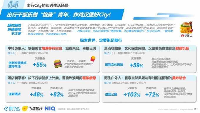 松弛還體現在“邊逛邊吃”。報告顯示,肉類零食線上銷售額年同比為8%,清明期間餓了么送到酒店和景點的鹵味熟食外賣量同比增長在60%上下,出行場景正在成為餐飲外賣增長的新亮點。去年國慶期間,餓了么送往交通樞紐、酒店、文化場館的漢堡薯條外賣量均同比增長在50%上下?Х雀浅鲇卫m(xù)航的必備,過去12個月,餓了么異地外賣咖啡訂單量同比增長95%,在所有異地外賣餐飲品類中增幅位列第一。國慶期間,送往娛樂場所和交通樞紐的咖啡外賣量均同比增長超過120%。
