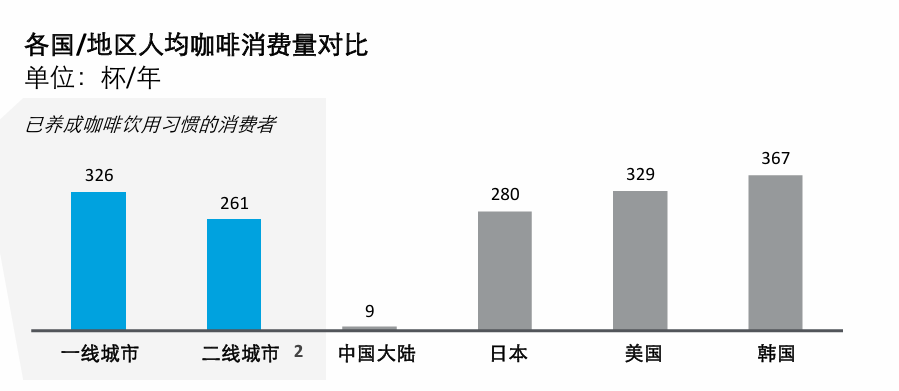 二是,尚未被激發(fā)的廣泛下沉市場。報告指出,國內(nèi)一、二線城市已養(yǎng)成咖啡飲用習(xí)慣的消費者,其人均年消耗量分別為326杯、261杯。相比之下,全國范圍這一數(shù)據(jù)為9,這也意味著廣大下沉市場被平均,其真實消耗量遠(yuǎn)低于9杯。