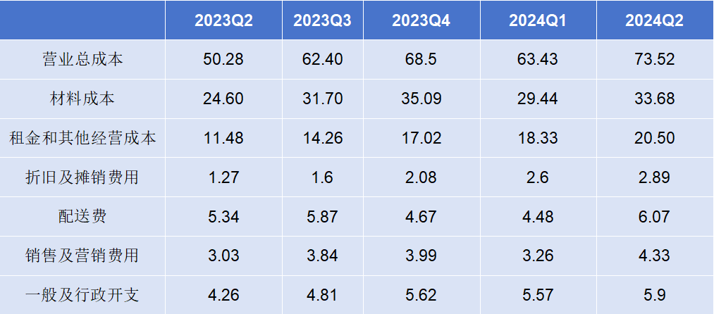 隨后的13個月里,瑞幸狂飆式擴(kuò)張了一萬家門店。這為瑞幸?guī)砹烁嘤脩艉蜖I收增長,相對應(yīng)的成本也在增加,尤其是材料成本、租金和其他經(jīng)營成本、折舊及攤銷費用以及配送費這四項。