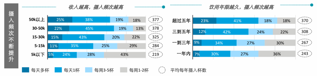 一是,得益于咖啡的成癮性、心理依賴等,對于已經(jīng)養(yǎng)成喝咖啡習(xí)慣的消費者來說,超過50%的人群會不斷增加咖啡攝入頻次——從低頻用戶發(fā)展成高頻用戶,提升咖啡消耗量。