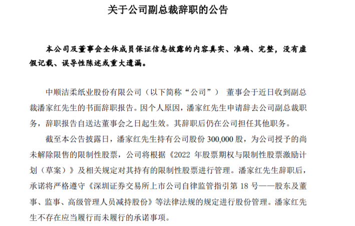 就在本次財(cái)報(bào)發(fā)布后,中順潔柔又披露了一則副總裁辭職的公告,公告內(nèi)稱(chēng)副總裁潘家紅因個(gè)人原因申請(qǐng)辭任。據(jù)悉,潘家紅曾任福建恒安集團(tuán)有限公司的發(fā)展部總監(jiān)以及金紅葉的COO一職。