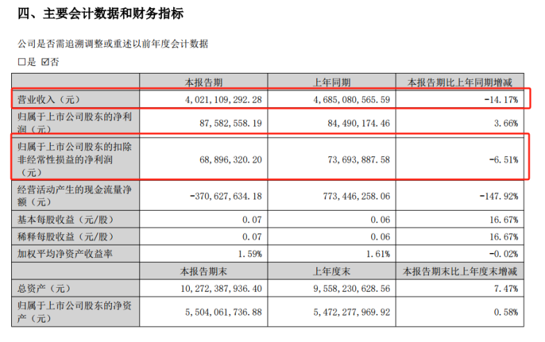 8月28日中順潔柔發(fā)布的半年報(bào)數(shù)據(jù)顯示,中順潔柔公司報(bào)告期內(nèi)實(shí)現(xiàn)營(yíng)收40.21億元,同比下降14.17%;扣非凈利潤(rùn)為6889.63萬(wàn)元,同比下降6.51%。