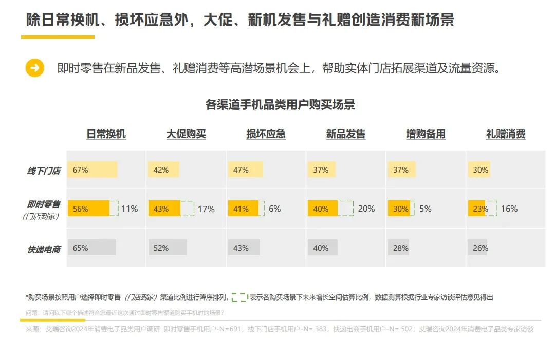 第三階段是2020年至今,隨著信息傳播速度的加快和消費(fèi)觀念的變化,消費(fèi)者在看到心儀的手機(jī)產(chǎn)品后,往往希望能夠盡快入手。美團(tuán)閃購、京東秒送等即時(shí)零售平臺滿足了消費(fèi)者對時(shí)效的要求,成為消費(fèi)電子產(chǎn)品銷售的新藍(lán)海。