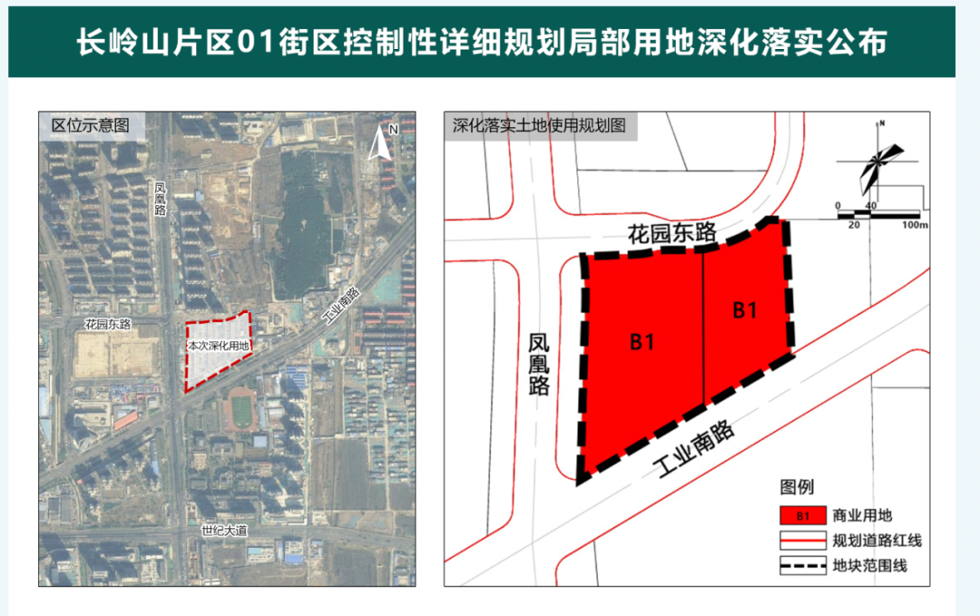 濟(jì)南市自然資源和規(guī)劃局在今年6月28日發(fā)布了長(zhǎng)嶺片區(qū)01街區(qū)控制性詳細(xì)規(guī)劃局部用地深化落實(shí)公布的信息,地塊就是鳳凰路以東、工業(yè)南路以北、花園東路以南,明確了地塊由原來的教育科研用地調(diào)整為了商業(yè)用地。
