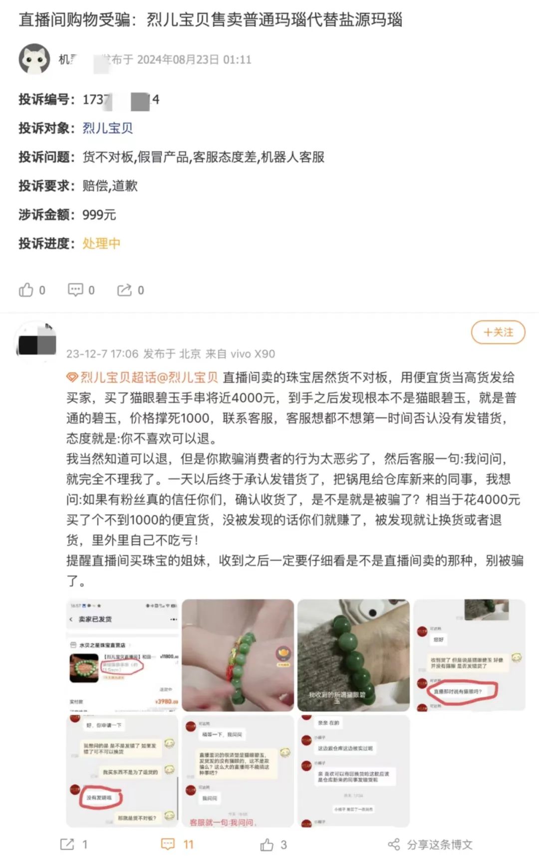 另一邊,有消費(fèi)者在黑貓平臺(tái)投訴,自己在“烈兒寶貝”直播間購物被騙,“烈兒寶貝”售賣普通瑪瑙代替鹽源瑪瑙。類似的情況,在微博上也有網(wǎng)友反映。