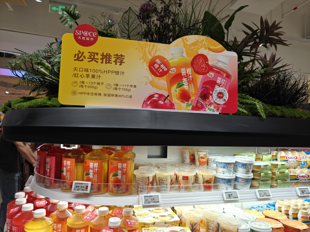 如天口味100%HPP紅心蘋果汁/HPP橙汁,天虹選擇了國內(nèi)標(biāo)準(zhǔn)最高、產(chǎn)能最大、品類最全、工藝最先進(jìn)的HPP飲品智造工廠,HPP工藝是一種「以水為介質(zhì),在靜高壓100MPa~600MPa和12℃下保持幾秒~幾分鐘,從而殺菌保鮮」的超高壓殺菌技術(shù),NFC+HPP工藝使商品口感鮮人一步、營養(yǎng)更加豐富,品項(xiàng)推出后大獲成功。