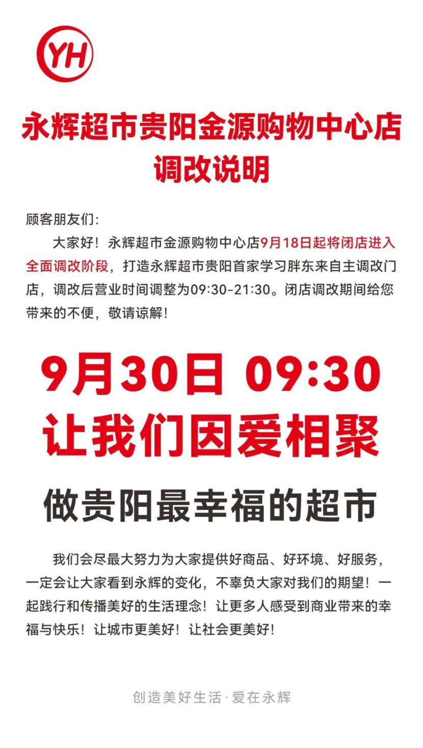 9月28日消息,永輝超市貴陽金源購物中心店計劃將于9月30日恢復(fù)正常營業(yè)。
