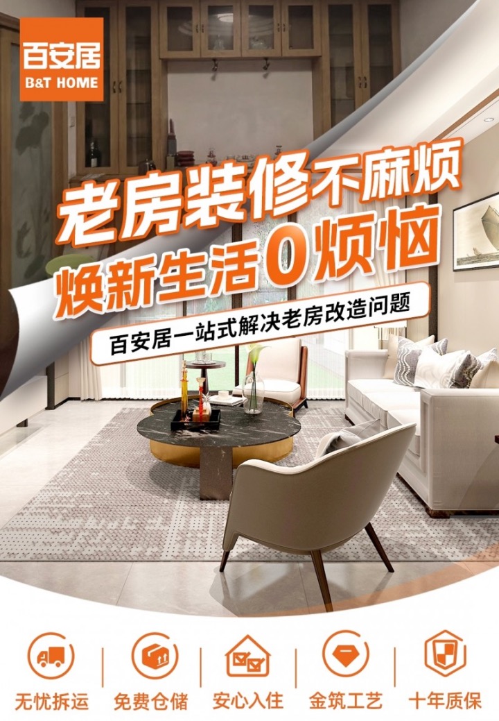 值得關(guān)注的是,為助力老房裝修,百安居推出“換新享補貼、拆舊不花錢”的惠民服務(wù),簽約裝修可享受15%的人工補貼。另外還有免費倉儲、無憂拆運、十年質(zhì)保等多重福利,為消費者提供一站式老房改造、安心入住服務(wù)。