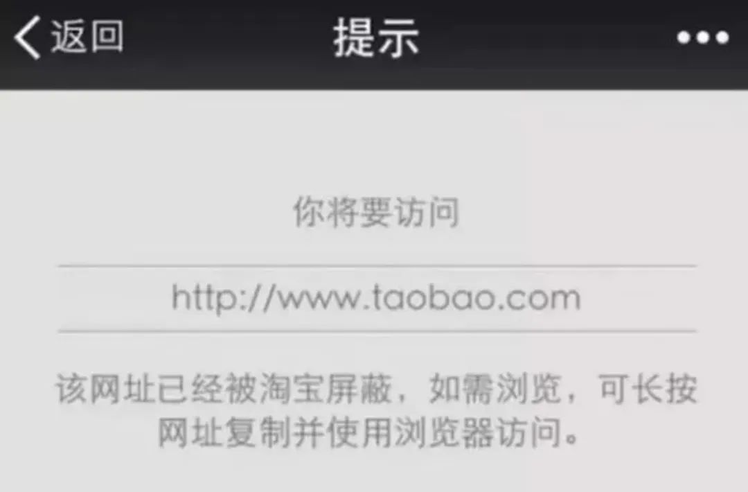 但畢竟被封鎖的對象,是另一互聯(lián)網(wǎng)巨頭,騰訊自然是不肯罷休。隨后就把微信上淘寶相關(guān)鏈接全部封禁,直接提示用戶要訪問的網(wǎng)址“已經(jīng)被淘寶屏蔽”,用戶只能通過復(fù)制瀏覽器打開。