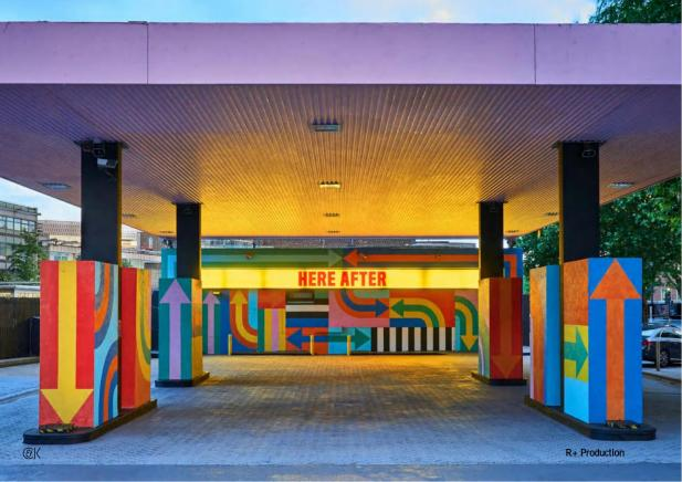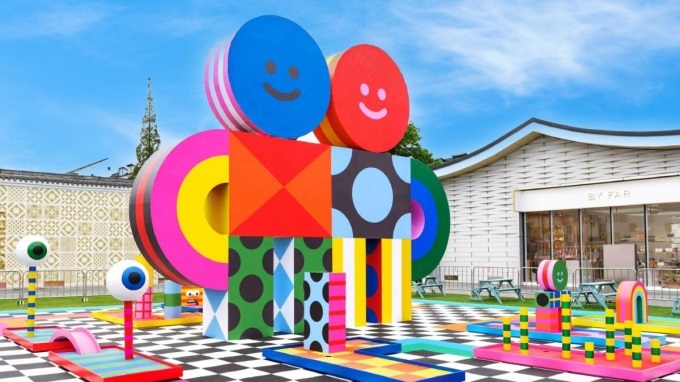 《迷你高爾夫》作為藝術(shù)家的沉浸式互動(dòng)裝置作品,是Craig & Karl針對(duì)傳統(tǒng)戶外高爾夫運(yùn)動(dòng)做的一次藝術(shù)化的嘗試和改變,2022年首次在倫敦金絲雀碼頭展出。藝術(shù)家將傳統(tǒng)的戶外高爾夫運(yùn)動(dòng)進(jìn)行輕量化和娛樂化的體現(xiàn),展示的9洞球場(chǎng)是一個(gè)全新的設(shè)計(jì),它可以同時(shí)供36人進(jìn)行競(jìng)技比賽或玩耍。藝術(shù)家將球場(chǎng)上的障礙物以最小化的流行雕塑形式呈現(xiàn),極具個(gè)性,并且使用了他們標(biāo)志性的色彩搭配。在球場(chǎng)中間是一對(duì)將近7米高的“積木人”,它們掐腰矗立在球場(chǎng)中間就像Craig&Karl兄弟親密無(wú)間的合作,微笑著面向來(lái)往的觀眾。通過(guò)迷你高爾夫,藝術(shù)家創(chuàng)造了一個(gè)充滿樂趣和輕松的環(huán)境,讓人們可以近距離體驗(yàn)和參與藝術(shù)作品。