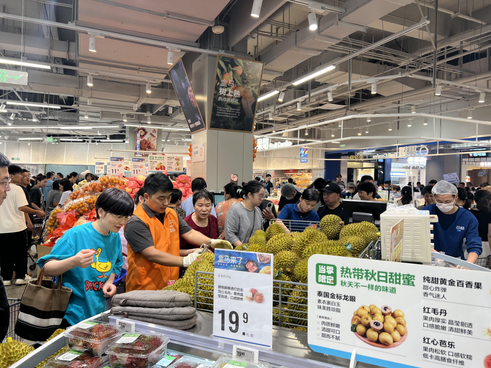 開業(yè)當天,盒馬的金枕榴蓮圍滿了人,門店不得不增派人手,幫助顧客開榴蓮。開業(yè)不到兩小時,金枕榴蓮銷售持續(xù)火爆,穩(wěn)居銷量TOP1。此外,盒馬爆款的貓山王榴蓮千層蛋糕也非常受歡迎,貨架上擺放的百余個蛋糕很快被搶購一空,不得不臨時補貨。