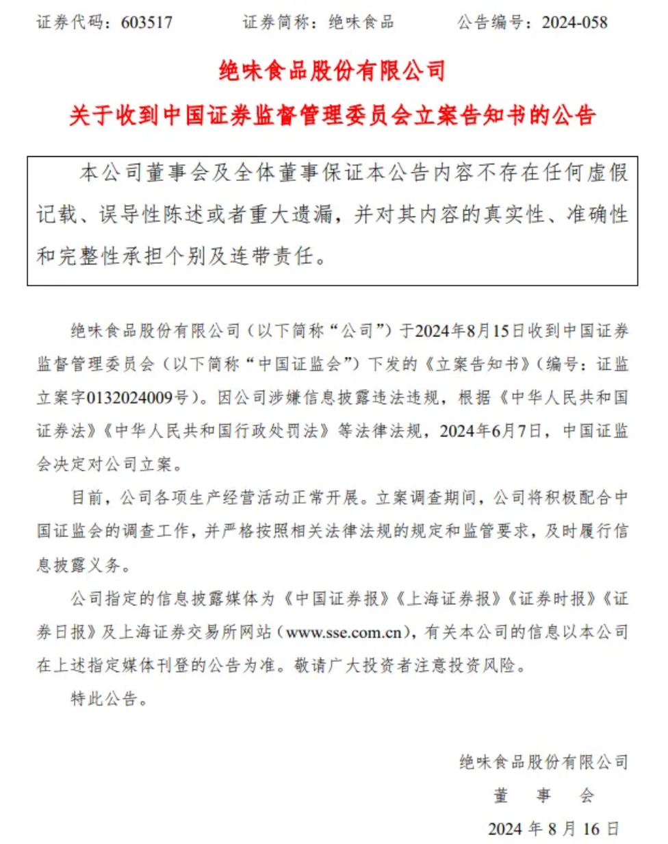 此外,在2024年8月份,絕味食品因涉嫌信息披露違規(guī),遭證監(jiān)會(huì)立案調(diào)查,股價(jià)應(yīng)聲跌停,股民信任遭受重創(chuàng),市場(chǎng)信心進(jìn)一步動(dòng)搖。