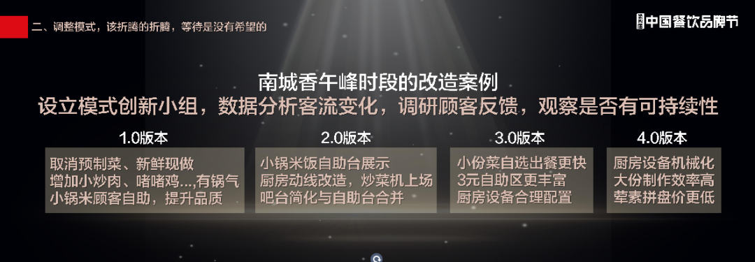 有人說(shuō),行業(yè)超一千家門(mén)店的品牌很多,學(xué)著抄不就行了?我也不羨慕人家。南城香流水最低時(shí)也是別人的雙倍,但我們希望的不只是雙倍流水。為了尋找突破口,我們徹底調(diào)整經(jīng)營(yíng)模式,并設(shè)定了兩年的調(diào)整期。