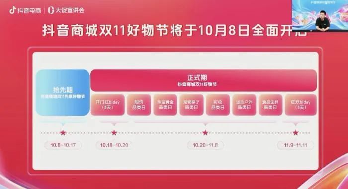 而抖音更是遙遙領(lǐng)先,其雙11活動(dòng)從10月8日就已經(jīng)開始搶先期,直到10月17日結(jié)束,鎖定國(guó)慶節(jié)后的購(gòu)物需求;10月18日至11月11日為正式期。