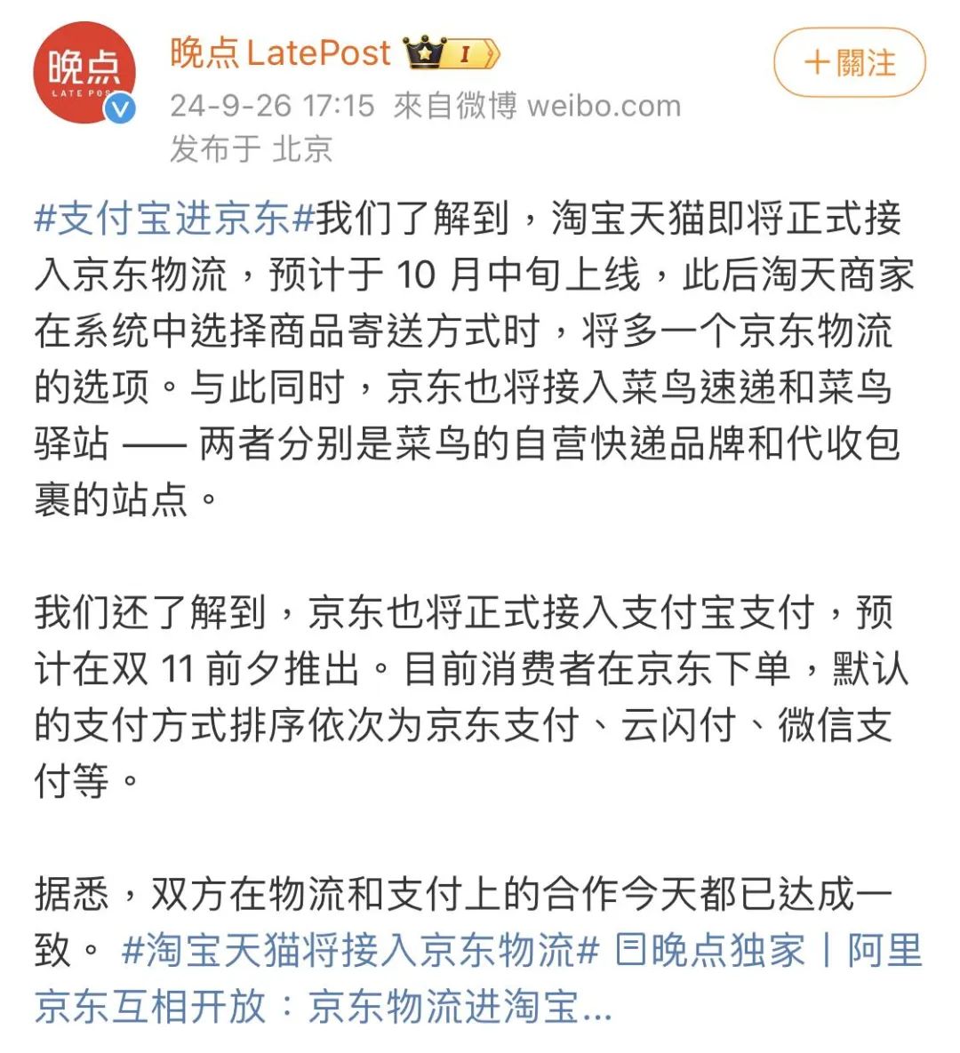 同時(shí),京東亦將接入阿里巴巴旗下的菜鳥速遞與菜鳥驛站網(wǎng)絡(luò),實(shí)現(xiàn)代收包裹、共享寄送入口及包裹寄存等服務(wù)的無(wú)縫對(duì)接,雙方物流和支付體系正逐步融合。