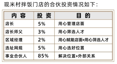 簡(jiǎn)言之,“合伙人制度”可以讓米村拌飯?jiān)诟冻鰳O少成本的基礎(chǔ)上,憑借事業(yè)合伙人的資金,快速擴(kuò)張。