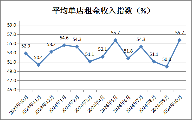平均單店租金收入指數(shù)為55.7%,較上月大幅回升5.7個百分點,迅速重回12個月以來新高。分析認(rèn)為,近期的經(jīng)濟政策明確支持房地產(chǎn)市場企穩(wěn)回暖,租賃經(jīng)營類企業(yè)信心恢復(fù)超出預(yù)期,表明消費類相關(guān)投資正在快速回暖。