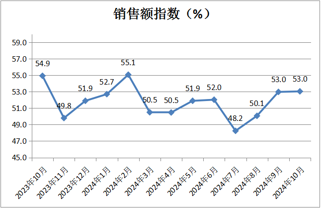 銷售額指數(shù)為53.0%,與上月持平。分析認(rèn)為,國慶假期返鄉(xiāng)消費和旅游消費增加,延續(xù)了中秋消費暢旺的勢頭,商品經(jīng)營類企業(yè)對10月消費旺季的預(yù)期不減。