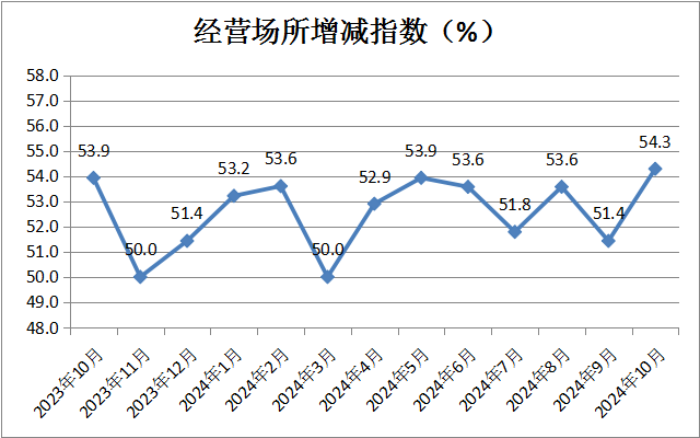 經(jīng)營場所增減指數(shù)為54.3%,較上月上升2.9個百分點,創(chuàng)12個月以來的新高,表明租賃經(jīng)營類企業(yè)開新店的信心增強。