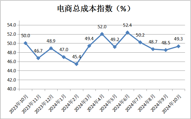 電商總成本反向指數(shù)為49.3%,較上月小幅上升0.8個百分點,結(jié)束連續(xù)三個月的成本上升趨勢,表明電商經(jīng)營類企業(yè)成本壓力逐漸降低。
