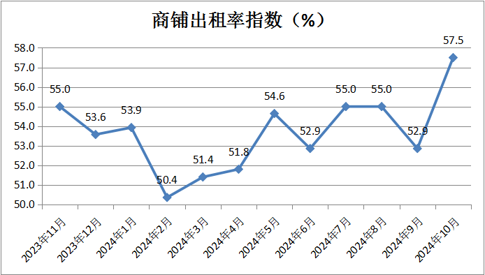 商鋪出租率指數(shù)為57.5%,較上月大幅上升4.6個百分點,創(chuàng)12個月以來的新高,表明租賃經(jīng)營類企業(yè)對10月份的招商經(jīng)營非常樂觀。