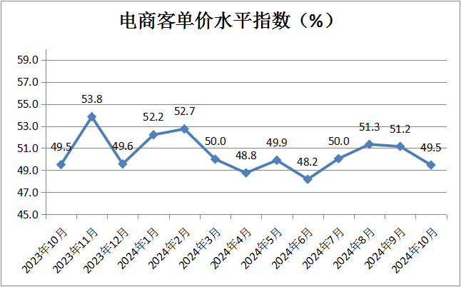 電商客單價水平指數(shù)為49.5%,較上月下降1.7個百分點。分析認(rèn)為節(jié)假日線下消費,一定程度上影響了電商客單價水平。