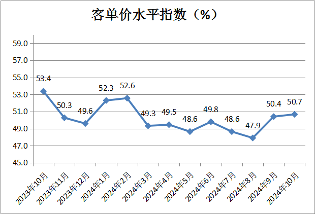 客單價水平指數(shù)為50.7%,較上月微升0.3個百分點,維持在擴張區(qū)間且增幅略有擴大。分析認(rèn)為,家電等大宗商品以舊換新政策落地見效和家庭節(jié)日消費是客單價水平提高的主要原因。