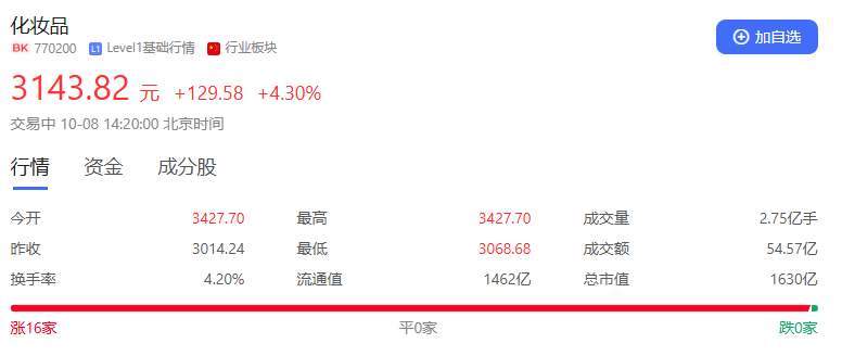 截止9月30日,從申萬行業(yè)來看,美容護(hù)理漲幅最大,高達(dá)14.08%,可以說是領(lǐng)漲。而在10月8日,百度股市通顯示,包含珀萊雅、上海家化、丸美股份等16家美妝企業(yè)的化妝品行業(yè)板塊,截止當(dāng)日下午兩點(diǎn)實(shí)現(xiàn)了4.23%的增幅,16家企業(yè)全線“飄紅”。