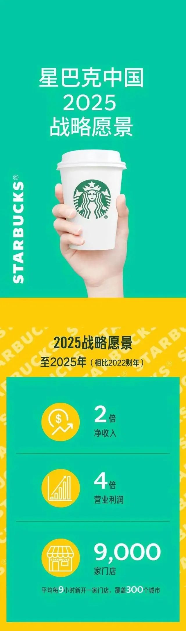 看起來(lái)星巴克在中國(guó)的開店速度已經(jīng)非常快,其實(shí)距離其本來(lái)的目標(biāo)仍有距離。因?yàn)閾?jù)《電與店》了解,早在兩年前的2022年9月,在星巴克中國(guó)提出的未來(lái)三年戰(zhàn)略愿景中其就曾發(fā)布“2025愿景”,即計(jì)劃到2025年在300個(gè)城市經(jīng)營(yíng)9000家門店,即平均每9小時(shí)開出一家新門店,同時(shí)每年創(chuàng)造超過10000個(gè)工作崗位。