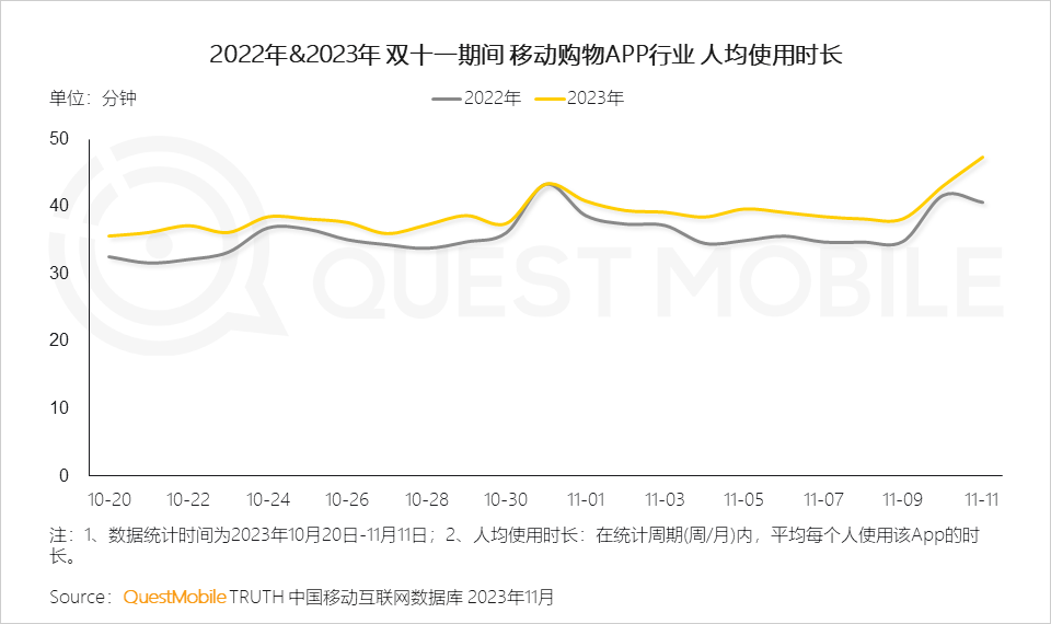 QuestMobile數(shù)據(jù)顯示,2023年雙11期間,移動(dòng)購物APP行業(yè)日均活躍用戶數(shù)約為7.0億,單日人均使用時(shí)長約為38.9分鐘,相比2022年同期的35.9分鐘上升約8.4%。同時(shí),在11月1日當(dāng)日平臺(tái)支付轉(zhuǎn)化效果也在提升,淘寶、手機(jī)天貓、京東、拼多多支付轉(zhuǎn)化比例分別達(dá)到了45.0%、41.9%、34.9%、29.7%。
