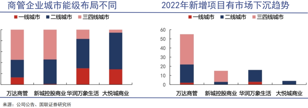 從分布地區(qū)來看,萬達商管在三四線城市布局占比超過一半,且近年來新增項目主要偏重下沉區(qū)域。大型商管企業(yè)中,僅有新城控股的吾悅廣場與之類似,據(jù)說只要萬達廣場開在哪里,吾悅廣場就會跟進入駐,萬達相當于給新城控股做了一個市場調研,但目前吾悅的數(shù)量和體量還遠遠不及萬達。