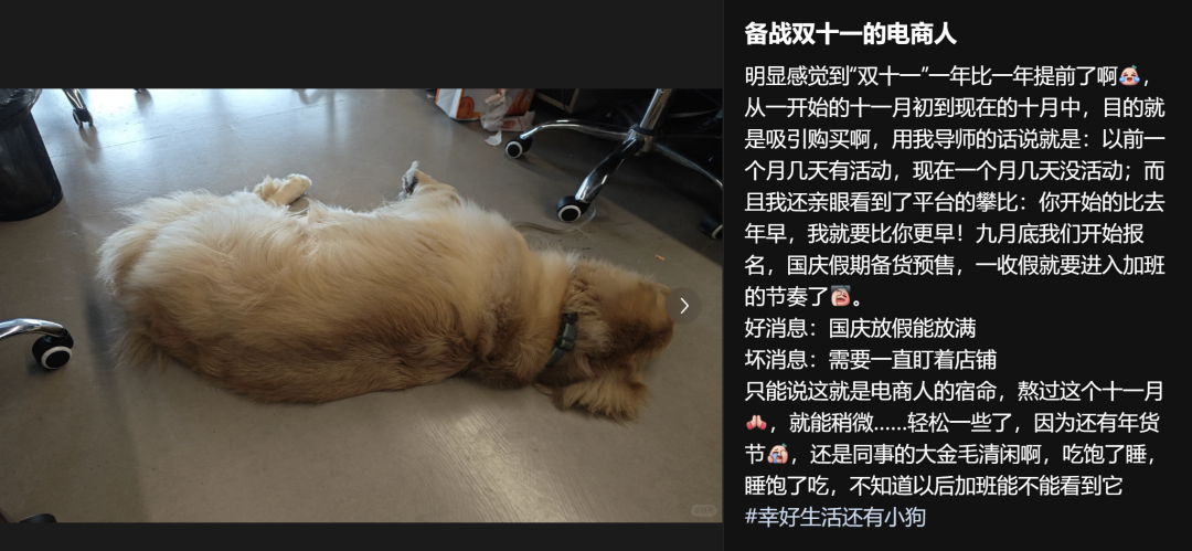 有杭州、蘇州地區(qū)的主播對(duì)《節(jié)點(diǎn)財(cái)經(jīng)》表示,最近還是主播的招聘旺季,不少老板預(yù)判今年雙11的直播貢獻(xiàn)要拉到7、8成,似乎各個(gè)品牌對(duì)于雙11格外積極。翻看小紅書,還有電商的員工為備戰(zhàn)雙11,帶著自家的大金毛在公司“駐扎加班”。