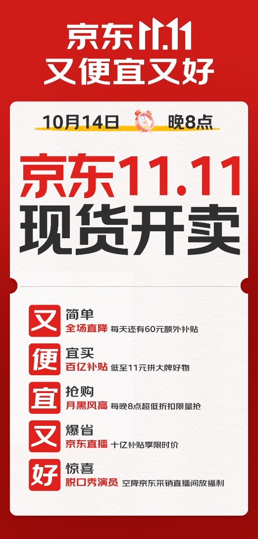 10月10日,京東宣布,今年京東11.11將于10月14日晚8點現(xiàn)貨開賣。據(jù)悉,今年京東11.11繼續(xù)延續(xù)“又便宜又好”的主題。
