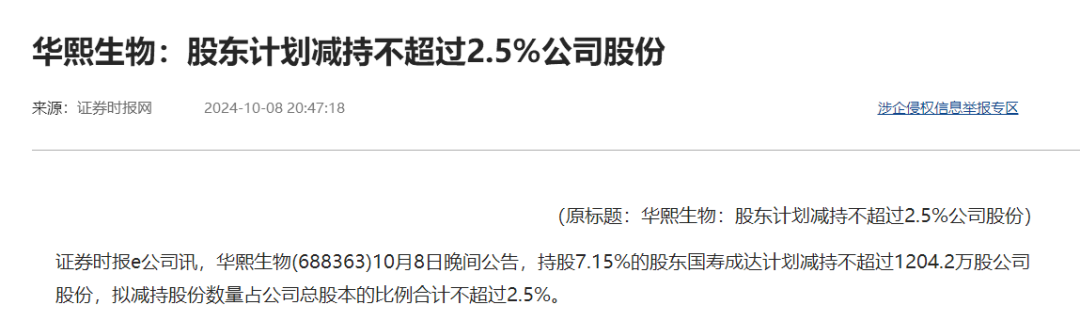 8日晚間,華熙生物發(fā)布股份減持公告,股東國壽成達(dá)(上海)健康產(chǎn)業(yè)股權(quán)投資中心(有限合伙)擬減持公司股份不超過1204.2萬股,減持比例不超過公司總股本的2.5%。據(jù)公開消息,國壽成達(dá)直接持有華熙生物股份數(shù)量為3443萬股,占公司總股本的7.15%。以華熙生物當(dāng)前的股價(jià)80.5元算,透過這份減持計(jì)劃,國壽成達(dá)將套現(xiàn)9.7億元。