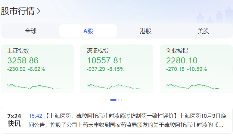 然而在大盤一片叫好之際,10月9日,A股開盤,滬指、深成指、創(chuàng)業(yè)板指三大指數(shù)開盤均大幅低開,滬深京三市個(gè)股近5000只下跌。截止9日收盤,上證指數(shù)為3258.86點(diǎn),下跌6.62%。