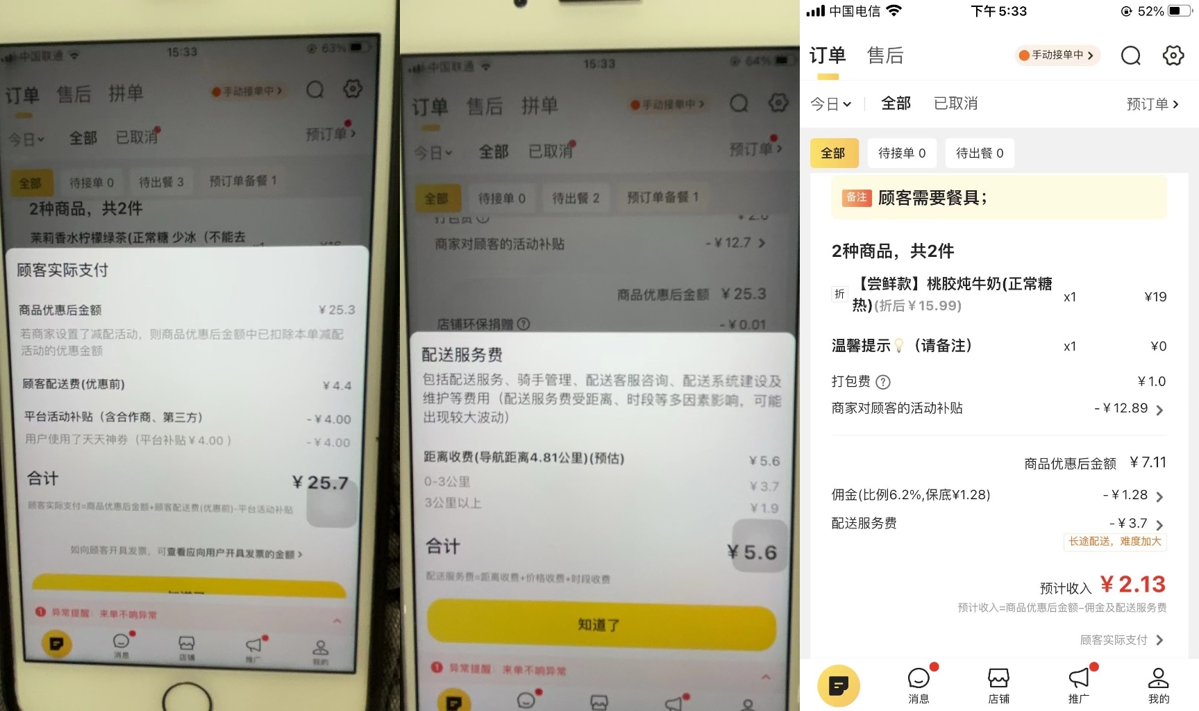 且現(xiàn)實(shí)情況往往更加嚴(yán)峻。多位商家告訴壹覽商業(yè),由于夜間配送費(fèi)增加、平臺(tái)發(fā)放優(yōu)惠券力度加大,夜間實(shí)收率在50%—60%左右,有時(shí)甚至?xí)濆X。