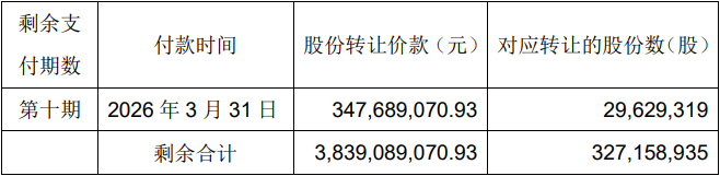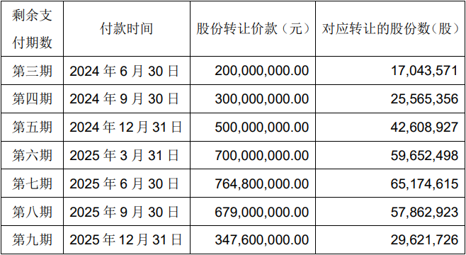 根據(jù)調(diào)整方案,第三期股份轉(zhuǎn)讓價款和后續(xù)幾期款項,共38.39億元,將繼續(xù)分8期執(zhí)行,付款周期較之前延長了半年,最后一次付款時間從2025年9月30日,延期至2026年3約31日