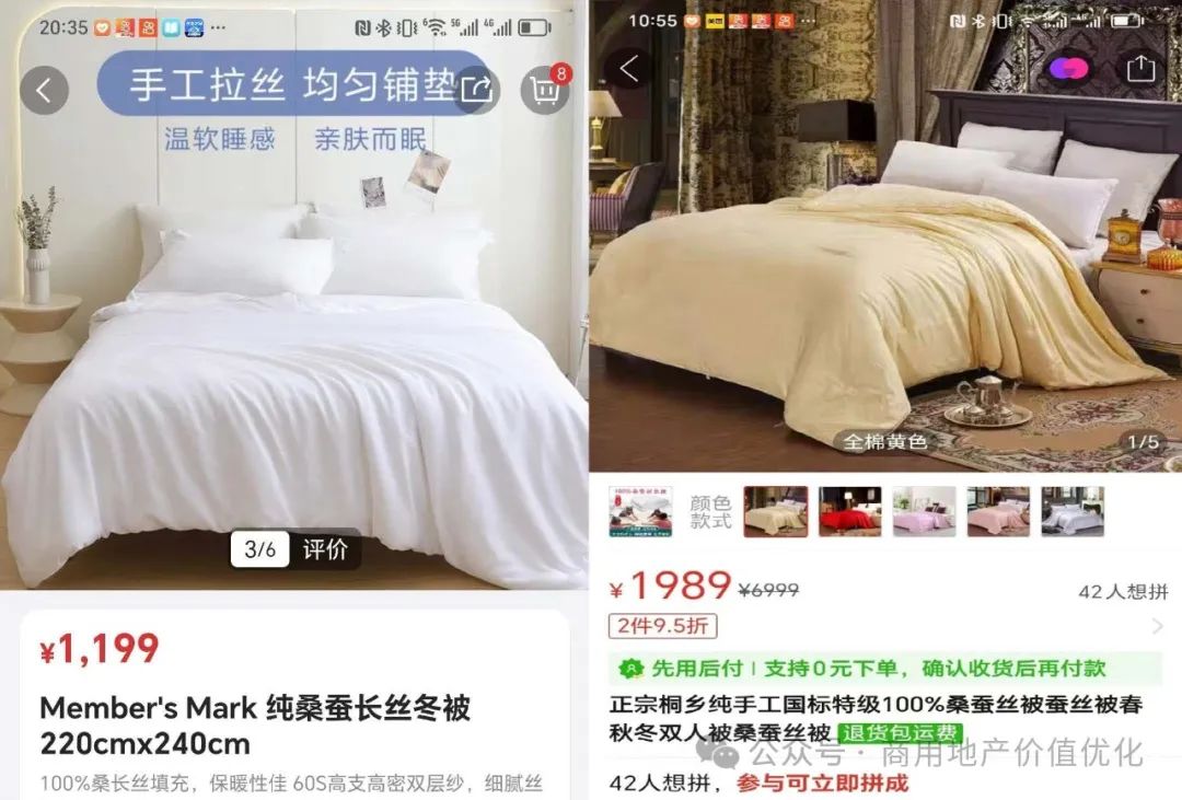 去年冬季我老伴決定買床絲綿被來替換用了二十幾年的舊棉被。她在山姆會員店里看中并買下了下圖左邊這床手工蠶絲被。后來,我們在其他商店與網(wǎng)站關(guān)注相同品牌與型號的手工蠶絲被,發(fā)現(xiàn)其價格比我們山姆會員店買的這床被子貴得多,我和老伴心里美滋滋的,突然之間感覺到好像我們在山姆會員店里發(fā)了一個小“財”,見下圖: