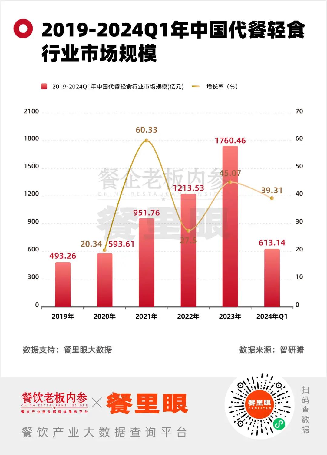 從整個(gè)輕食大盤(pán)來(lái)看,也是增長(zhǎng)的趨勢(shì)。智研瞻數(shù)據(jù)顯示,2019年至今中國(guó)代餐輕食行業(yè)市場(chǎng)規(guī)?焖倥噬,2023年整體市場(chǎng)規(guī)模達(dá)到了1760.46億元,今年Q1市場(chǎng)增長(zhǎng)率達(dá)到了39.31%。