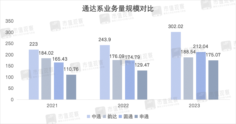 早在2021年,申通業(yè)務量僅有110.76億件,距離韻達的223億件還有超過1倍的距離。到2023年業(yè)務量已經(jīng)達到了175.07億件,與韻達的差距縮小至14.47億件。