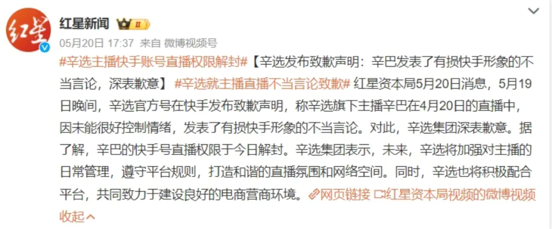 直到后來辛選集團(tuán)的率先低頭道歉,才讓這件事有了一個明朗的結(jié)果,辛巴賬號于第二天5月20日正式被快手解封。從結(jié)果來看,辛巴家族和快手暫時誰也離不開誰。