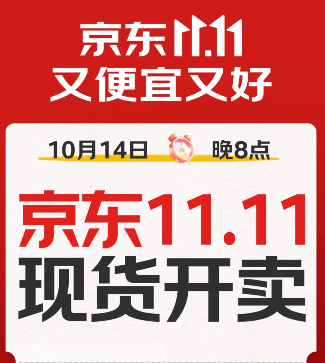 10月10日上午,京東官方微信公眾號推文稱“10月14日晚8點(diǎn),京東11.11現(xiàn)貨開賣”,確認(rèn)京東雙11開啟時間提前。