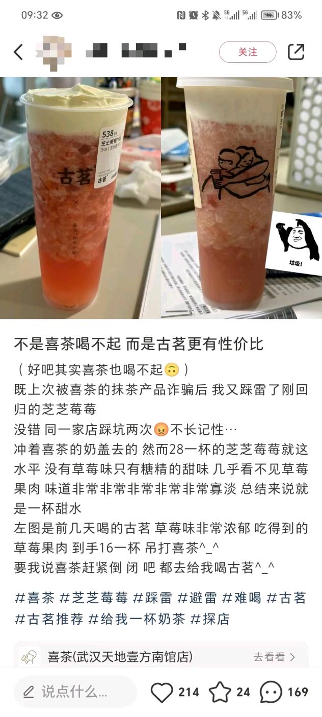 “不是喜茶喝不起,而是古茗更有性價(jià)比……喜茶28一杯的芝芝莓莓沒有草莓味只有糖精的甜味幾乎看不見草莓,而古茗草莓味非常濃郁,吃得到的草莓果肉,到手16一杯,吊打喜茶!