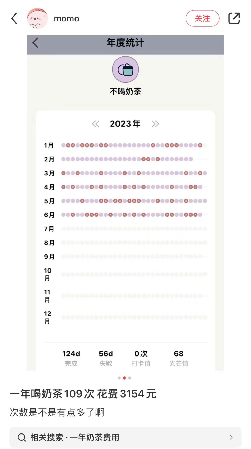 有小紅書網(wǎng)友表示,一年喝奶茶109次,花費(fèi)3154元。平均單次價(jià)值28元。還有人也估算出了,“平均一周三四杯,平均每杯價(jià)格25左右,一年下來要花4000多喝奶茶!