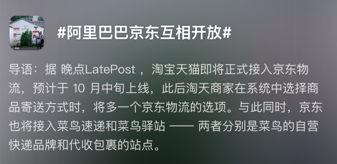 今年10月,淘寶天貓開始接入京東物流,同時(shí)京東也將接入菜鳥速遞和菜鳥驛站——兩者分別是菜鳥的自營(yíng)快遞品牌和代收包裹的站點(diǎn)。