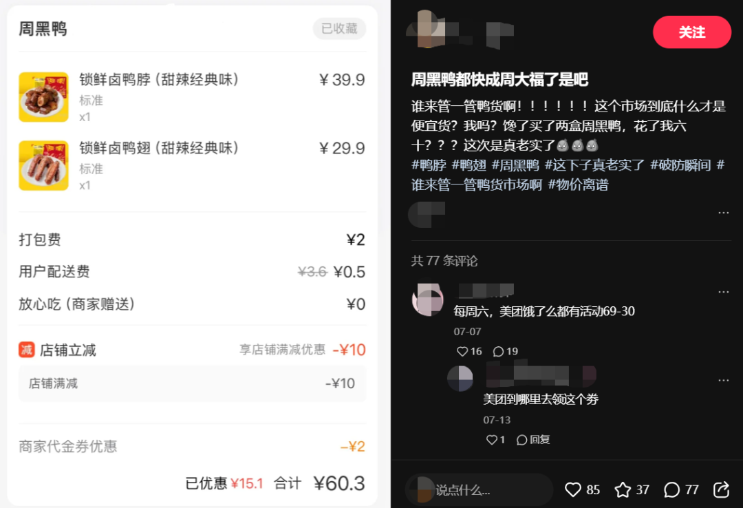 還有網(wǎng)友在外賣平臺下單周黑鴨時發(fā)現(xiàn),一盒鴨脖加一盒鴨翅就要60塊,“周黑鴨變成周大福了是吧?”