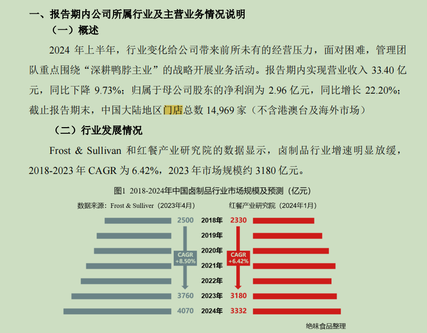 Frost & Sullivan(弗若斯特沙利文)和紅餐產(chǎn)業(yè)研究院的數(shù)據(jù)顯示,鹵制品行業(yè)仍保持增長趨勢,但規(guī)模增速逐漸放緩,與市場預(yù)期存在差距。