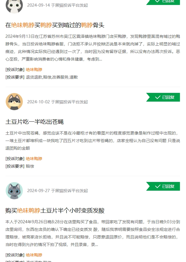 以絕味鴨脖為例,在“黑貓投訴”平臺上顯示有超1150條投訴中包含“絕味鴨脖”,近期就有用戶投訴稱“在絕味鴨脖買鴨脖買到啃過的鴨脖骨頭”、“土豆片吃一半吃出蒼蠅”、“購買絕味鴨脖士豆片半個小時變質(zhì)發(fā)酸”等食品安全相關(guān)問題。
