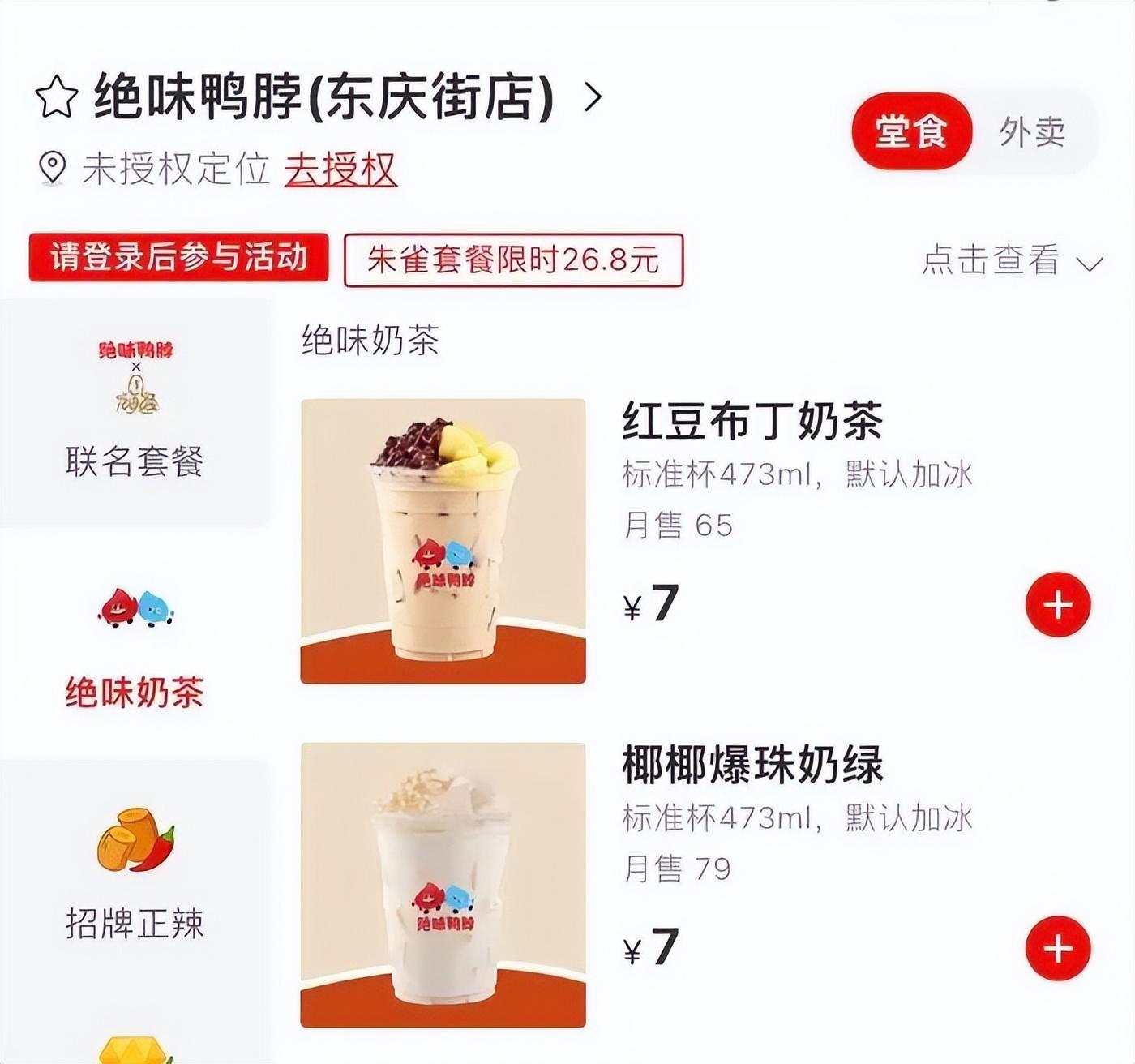 除了對外投資,絕味鴨脖還在自有門店嘗試售賣鹵味之外的新品類。9月,長沙部分絕味鴨脖店掛出了“11.9元購3杯原葉奶茶券”的橫幅,同時喊出了“奶茶配鹵味,快樂加倍”的口號。